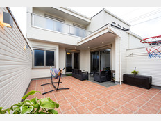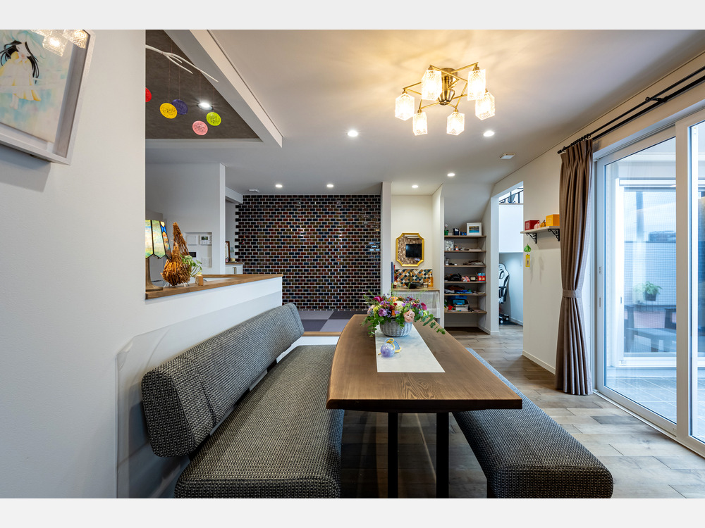 LDKからフラットにつながるタイル敷きのテラスは、セカンドリビングとしての役割を果たします。アウトドアファニチャーやハンモックを設置し、家族の団らんやホームパーティーなど多目的に活用可能。屋内と屋外の境界を感じさせない設計が、暮らしにさらなるゆとりをもたらします。