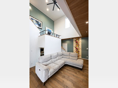 天井高の吹き抜けを取り入れたLDKは、空間全体に自然光がやさしく広がる明るい住まい。大きな窓と複数の高窓からたっぷりと光が差し込み、昼間は照明いらずの開放的な空間が広がります。木目調の天井とフローリングが、やすらぎと温かみをもたらしています。
