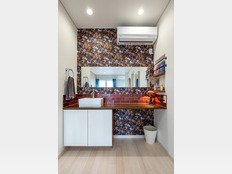 華やかな壁紙と落ち着いた木目が調和した、個性あふれる洗面空間