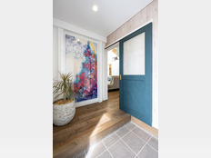スタイリッシュなブルーの引き戸と個性的なアートパネルが訪れる人を惹きつける印象的な玄関