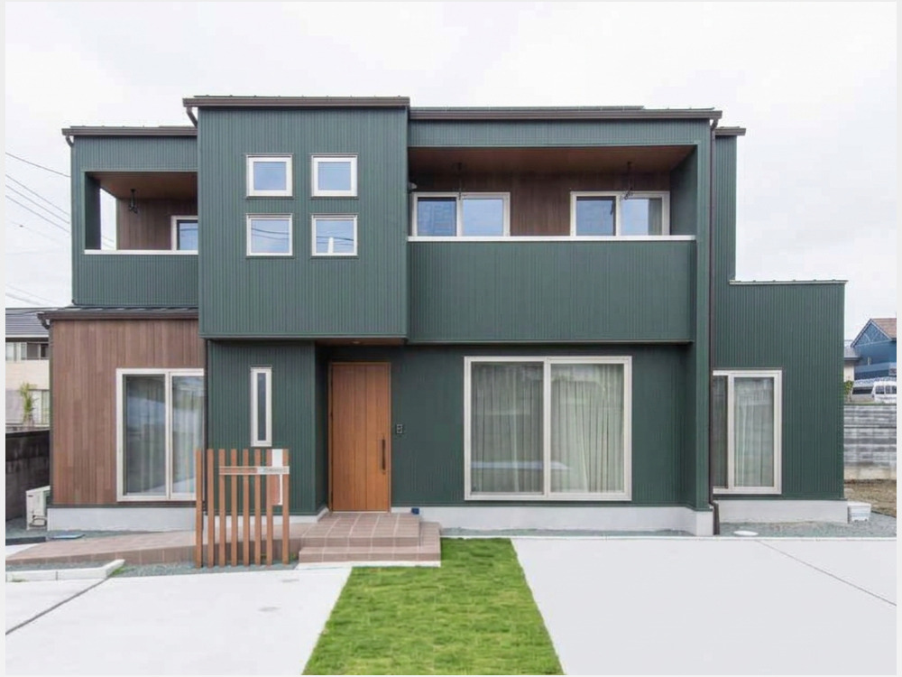 深いグリーンの外壁が印象的な、洗練されたモダンデザインの住まい。