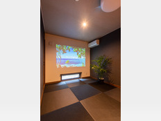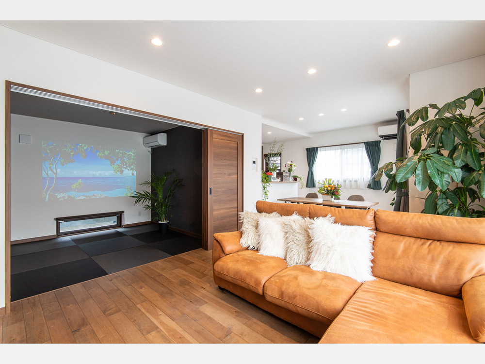 伝統と現代的なセンスが融合した落ち着きのある和モダン空間。ダークトーンのアクセントクロスと広い壁面がプロジェクターの没入感を高めるシアター空間を実現し、足元の地窓がプライバシーを守りつつ柔らかな光と広がりをもたらしています。