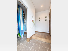 サーフボードを縦置きできる広々とした土間収納が、玄関を開けた瞬間に個性を演出。壁面のニッチや4つのスクエア窓がリズムを生み出し、光を採り込みながら開放的で遊び心のある空間に仕上げています。
