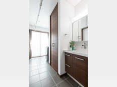 洗面・脱衣・洗濯・室内干しを直線に配置し、「洗う・干す」が最短で完結する効率的な家事動線を実現。深みのある木目調で統一した洗面台と天井高の収納が、落ち着いた高級感と抜群の収納力を両立させています。
