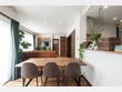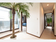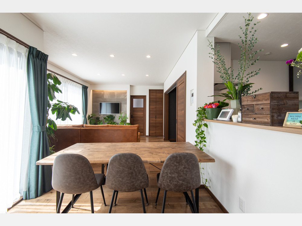 存在感のある大型の観葉植物と大きな窓からの自然光が、室内を屋外のような開放的な空間へと変えています。白の壁紙と明るいフローリングが光を効果的に反射させ、清々しく広がりを感じる住まいに仕上げています。