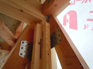 柱と梁は専用金物でしっかり接合し、壁には合板を貼って揺れを抑えます