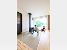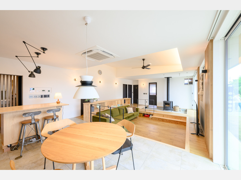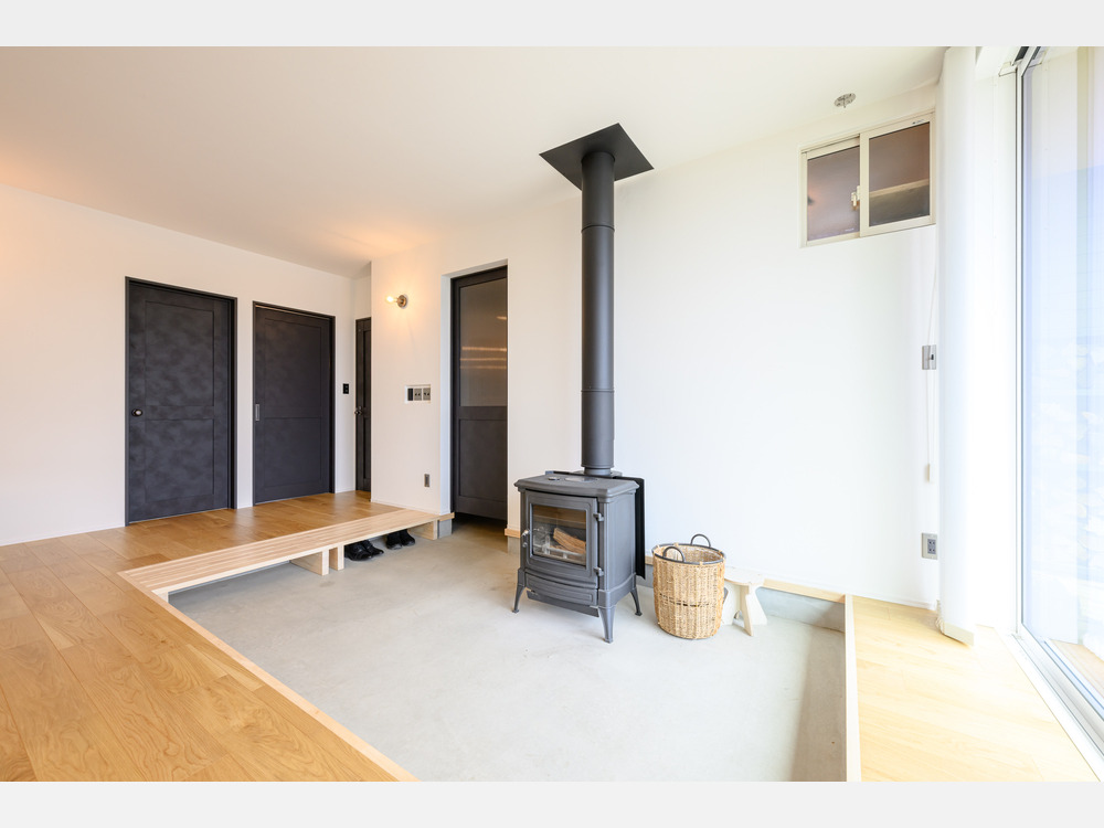 薪ストーブのやさしい炎が家族の時間をあたため、収納を備えたダウンフロアリビングが自然と人を集める居心地の良い空間に。